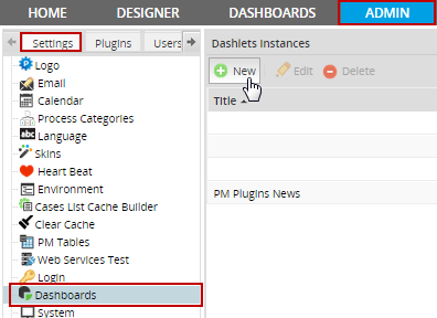 To create a new Dashlet instance, go to ADMIN > Settings > Dashboard: