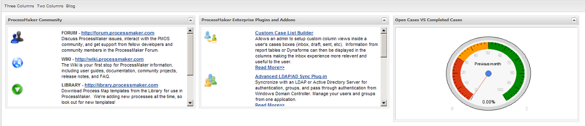 - Three Columns: The Dashlets are displayed in three columns as shown in the image below: