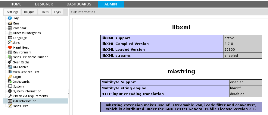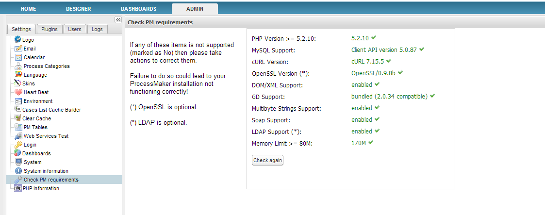 Inside the ADMIN tab, an option to check the ProcessMaker requirements was added in versions 2.5 and later. This option checks whether all the requirements are correctly installed and lists which versions are installed.