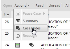 - Click the case to select the information of the case note that need to be displayed, then click on Actions on the above menu and select the option Case Notes.