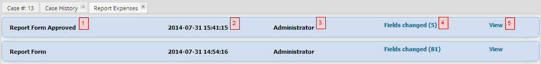 - Number of fields that were changed in the DynaForm. Click on this option to expand the detail of the changes which include the name of each changed field, its previous and new value.