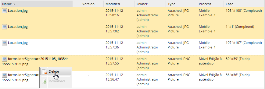 - Case: Name and Number of the case where a file uploaded or generated is related. Cases are not associated to a Process, even if they were created while running cases, so no information will be displayed.