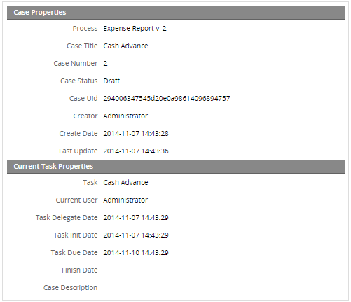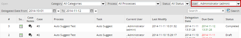 Includes cases that are being edited or advanced by the user but have not yet been submitted to the next task. A case status changes to "draft" when the assigned user has started to work on the current task, but has not completed it. New cases in their initial task automatically have "Draft" status when they are created. The status of the case changes from "To Do" to "Draft" when submitting a DynaForm or passing an Input Document, Output Document or external step.
