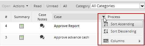 Cases are initially ordered first by their # (case number), but cases can be sorted in any column by clicking on its header. To switch between the ascending and descending orders, click on the up or down arrow which subsequently appears after clicking on a column header.