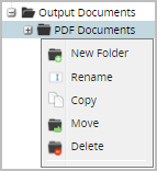 Take into account that folders can be manually created in this section and they can also be created by running cases where an Output or Input Document was created with a destination file defined for both of them. To manually create a folder, right click on the respective folder where the sub folder will be created. For instance, if it's required to create a folder at the root level, right click on