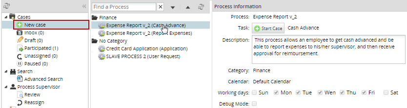 By selecting a process from the list, the Process Information located on the right side will display its information. The information shown is the following: name of the process, name of the initial task, description, category, the calendar related to the process, its working days, and the status of the debug mode.