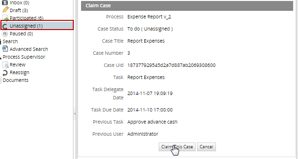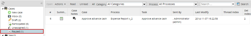 Includes cases that have been sent back to the process supervisor (to learn more about supervisors, see this documentation. This tab is available only if the user is a process supervisor and for that it is necessary that his/her role contains the PM_SUPERVISOR permission.
