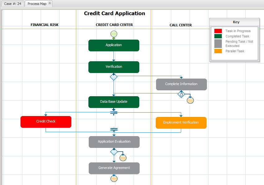 It's very useful for the user to check where in the process is the task on execution. Each task will be differentiated by color which represents a state of a task. Next to the process there is a Key with the colors explanation is displayed: