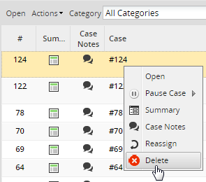 - Open: This option opens the case selected. A case must be selected from the list to use this option.