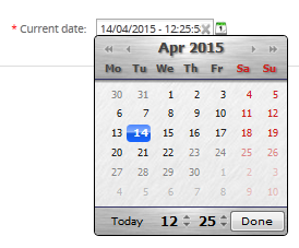 Clicking on a date field opens a calendar popup where the user can select the date. This helps standardize date formats and eliminates many careless errors. Date fields offer two buttons to the right of the field. The first opens the calendar popup, just like clicking on the data field. Clicking on the second button clears the date and set it to zero.