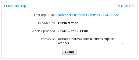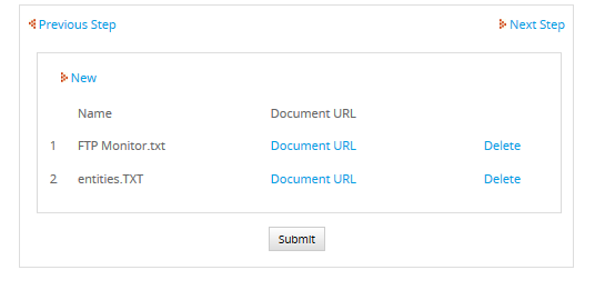 If versioning is enabled, new versions of an existing Input Document can be uploaded by clicking on the New Version link. To see a list of all the versions for an Input Document, click on its Version History link.