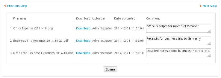 The subsequent DynaForm with an embedded grid will show the details of the three files: