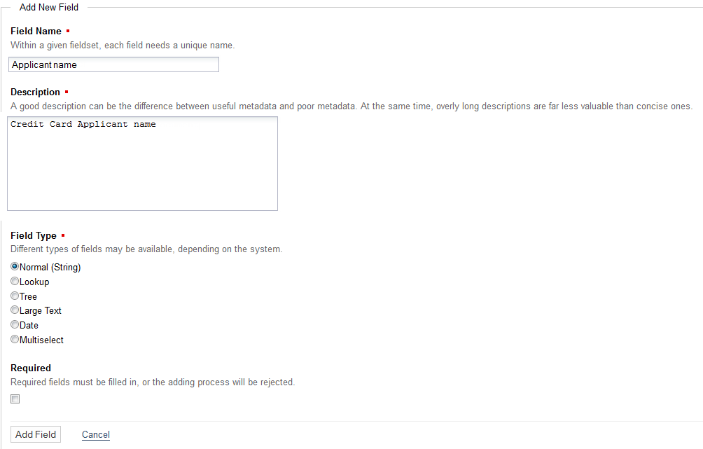 Configuring the metadata layer involves adding the document types, fieldsets and fields, so that ProcessMaker variables can be displayed next to each fieldset.