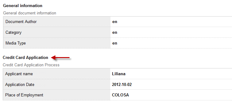 Checking the General Information: In this case a Field Set named Credit Card Application was created, so information created as field names will be displayed in the General Information section: