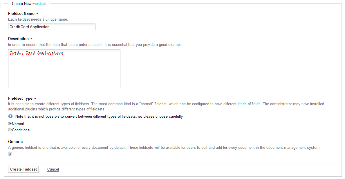 - Generic: A generic fieldset is one that applies to every document by default. These fieldsets will be available for users to edit and add for every document in KnowledgeTree.