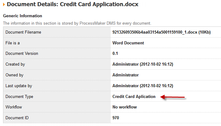 The Document Type in this example is Credit Card Application. It is important to create Document Types to manage large amounts of documents, which will be uploaded or generated in ProcessMaker and stored in KnowledgeTree.