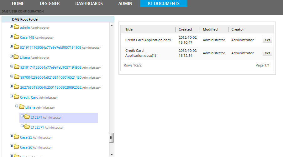 The ProcessMaker documents can then be accessed inside the KnowledgeTree web interface, but they can also be accessed from the KT DOCUMENTS menu (which is created by the plugin) inside the ProcessMaker interface. All KnowledgeTree folders to which the logged-in user has access are displayed. Click on a folder to see its files and subfolders.