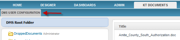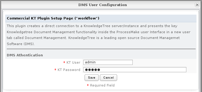 To set the KnowledgeTree login credentials for a user, login to ProcessMaker as that user and go to the KT DOCUMENTS menu and click on the DMS User Configuration submenu.