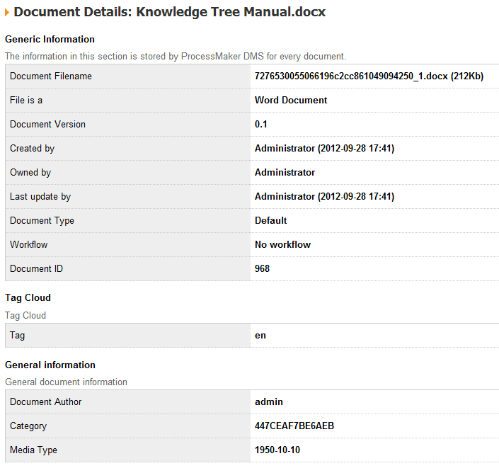 Checking the Generic Information: Once a case is running and a document is attached (Input Document) or generated (Output Document), open KnowledgeTree and go to destination path for the document to see its Generic Information: