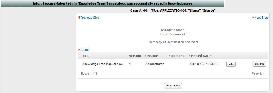 5. Once the DMS configuration is set, close the window and start a case. Attach a Document in the Input Document Window and once it is uploaded, this message will be displayed: Info: /ProcessMaker/admin/Knowledge Tree Manual.docx was successfully saved in Knowledgetree will display: