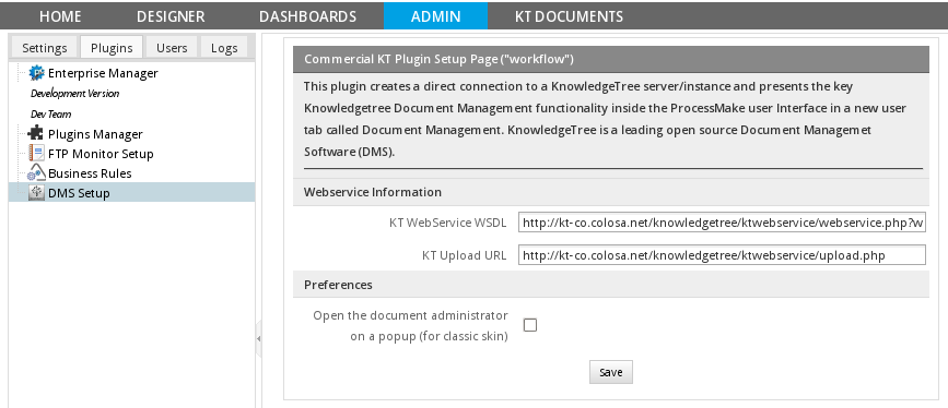 Go to ADMIN > Plugins > DMS Setup to configure how to connect to a KnowledgeTree Server.