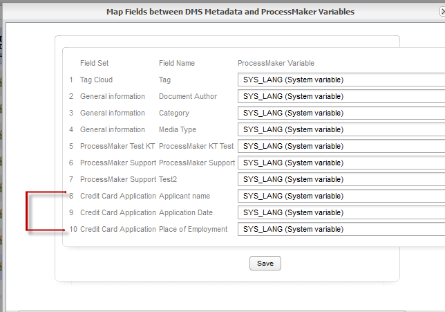 Map Fields between DMS Metadata and ProcessMaker variables are created to map case variables to KnowledgeTree, in other words it's possible to specify which variables will be used in knowledge tree to display specific information of an uploaded document depending on the case variables chosen.