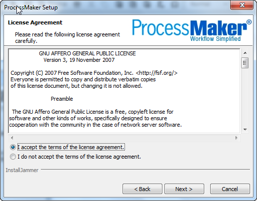 Mark the option to accept the GNU Affero General Public License version 3 license used by ProcessMaker and then click on Next.