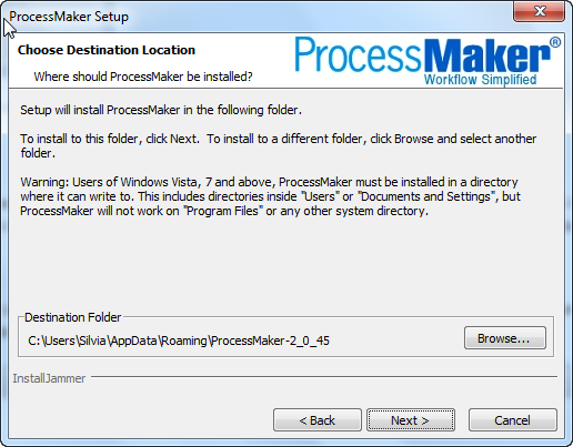 New security restrictions in Windows Vista/7/8/Server 2008 don't allow a program running on Apache to write to system files, so ProcessMaker can not be installed in the %ProgramFiles% directory. By default, ProcessMaker will be installed in the user's directory at C:\Users\USERNAME\AppData\Roaming\ProcessMaker-2_X_X