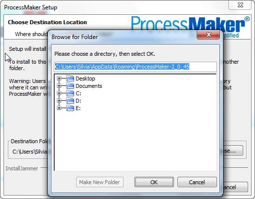 To install in a new directory, click on Make New Folder to create a folder and give it a name, such as ProcessMaker.