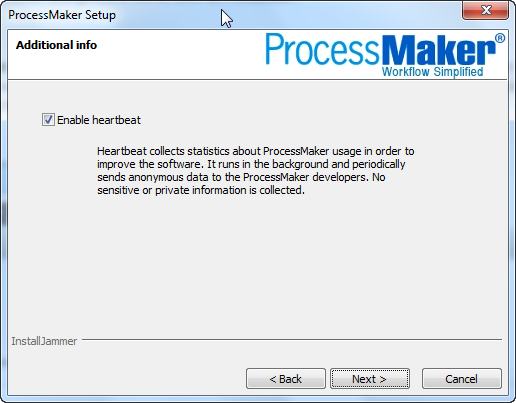 Next, decide whether to select the option for Enable heartbeat. The "Heartbeat" is used to collect anonymous statistics every seven days about the number of workspaces, users and processes being used. This information is collected to help the ProcessMaker developers identify usage patterns and help improve the application in the future. If you do not what this information to be sent to the ProcessMaker developers, do NOT select this option.