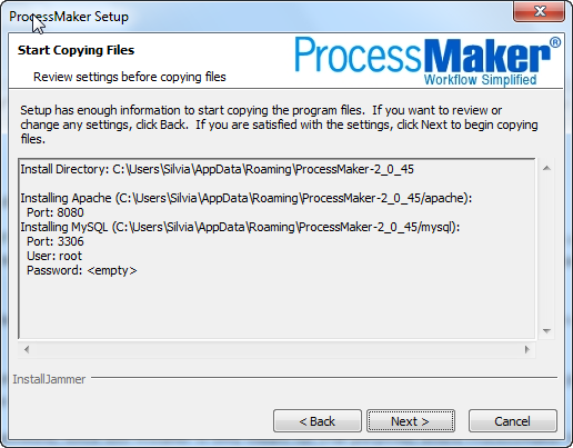 The ProcessMaker Windows Installer based on InstallJammer is designed to automatically install ProcessMaker without asking the user for confusing information such as port numbers for Apache and MySQL and passwords for MySQL and phpMyAdmin. The Windows Installer is designed for quick installations to be used on the local machine. To install ProcessMaker to be used over a local network or on the internet or to configure port numbers and passwords used by Apache, MySQL and phpMyAdmin, either do a manual install of ProcessMaker or reconfigure ProcessMaker after using the automatic installer.