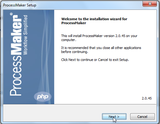 The user-friendly Windows Installer for ProcessMaker 2.0 automatically installs Apache 2.2.16, MySQL 5.1.50, PHP 5.2.14 and phpMyAdmin 3.3.7 and configures them to function with ProcessMaker.