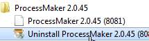 To uninstall ProcessMaker, in the Windows menu, go to Start > All Programs > ProcessMaker 2.X.X > Uninstall ProcessMaker 2.X.X