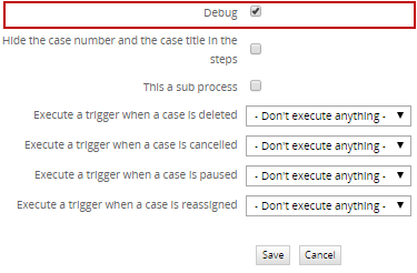 To activate "Debug" mode, right click on a blank area in the Process Map and select the option "Edit Process". In the dialog box which appears mark the "Debug" checkbox and click "Save".