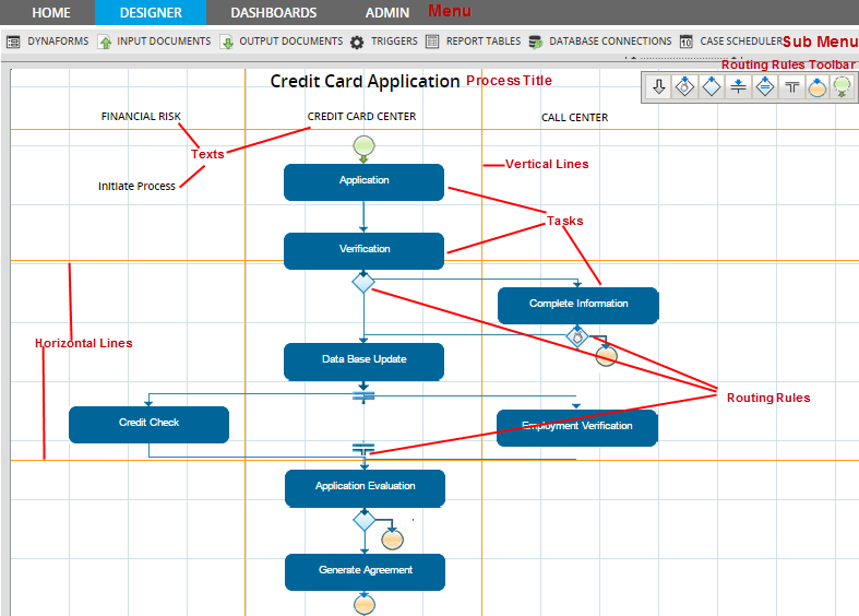 - Routing Rules Toolbar: it contains routing rules, control workflow between tasks in a process.