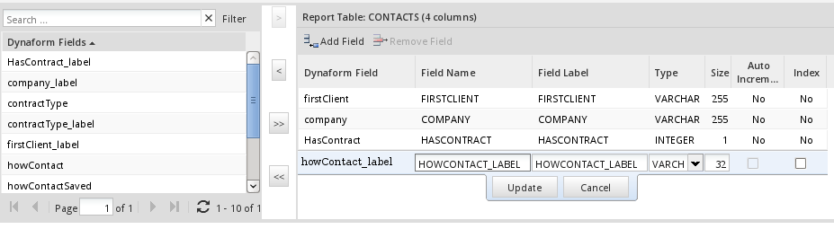 It is possible to change the order of the fields in the Report Table by dragging and dropping the fields to new locations in the list. It is also possible to change the Field Name, Field Label, Type, Size and Index properties of the fields in the Report Table. After selecting the fields to include in the Report Table, double click on a characteristic of the field to edit it.
