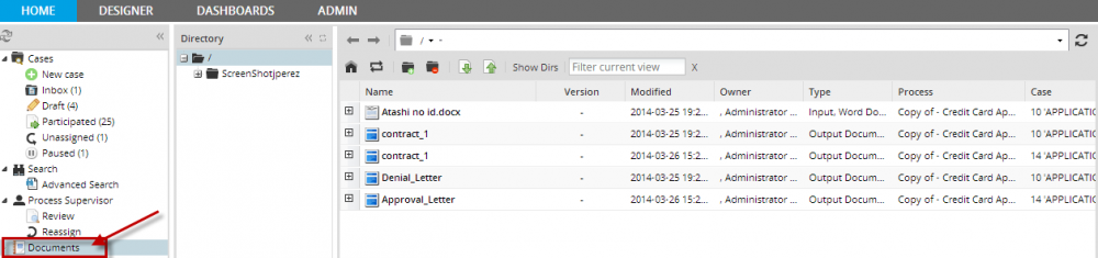 In addition, it provides access to the Documents option, which allows users to view any files which were uploaded (Input Documents and attached files) or generated (Output Documents) while running cases.