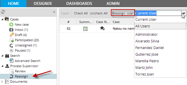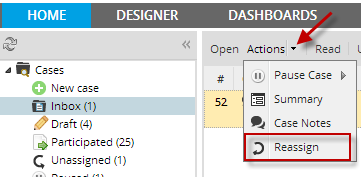In addition, the PM_REASSIGNCASE permission adds the Reassign option to the Actions menu, which is available under the Inbox and Draft options and when running a case. Note that it is NOT possible to reassign cases under the Review, Advanced, Participated, Participated or Paused options, nor is it possible when opening a case summary or read-only access withProcess Permissions.