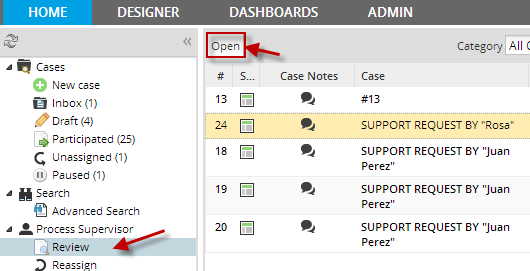 The PM_SUPERVISOR permission allows a user to be assigned as a Process Supervisor, which allows a user to view and modify data in DynaForms and Input Documents for designated processes. This permission adds the Supervisor section to the sidebar under the HOME menu and the Review option, which shows a list of cases which the Process Supervisor can review. Only cases with a "To Do" or "Draft" status are shown in the list and the cases must be from processes where the user has been assigned as a Process Supervisor.