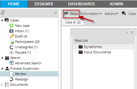 After opening the case, the DynaForms and Output Documents which can be edited by the Supervisor will be available inside a "Step List" dialog box.