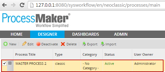 To verify that the second connection is working, let's access ProcessMaker and view all processes created in the DESIGNER: