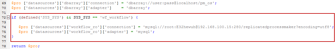 $pro ['datasources']['workflow_ro']['connection'] = 'mysql://MYSQL-USER:PASSWORD@SLAVE-SERVER-ADDRESS:PORT/SLAVE-DATABASE-NAME?encoding=utf8';