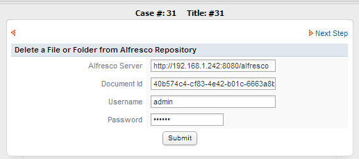- pwd: Valid Admin password to connect to Alfresco server