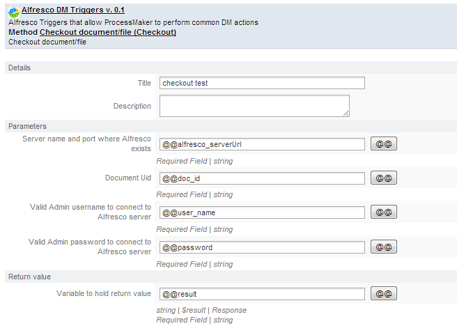 The integration between Alfresco and ProcessMaker, brings the possibility to manage the Alfresco environment; for this purpose many triggers may be created on ProcessMaker, which modify behavior of Alfresco content