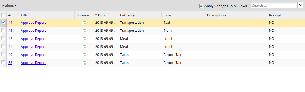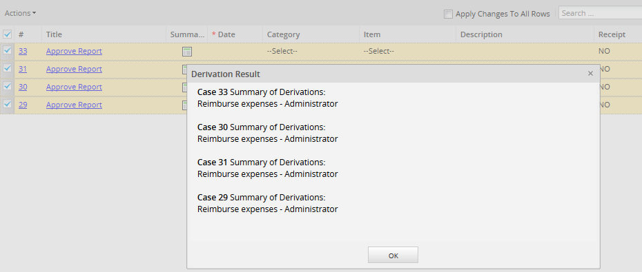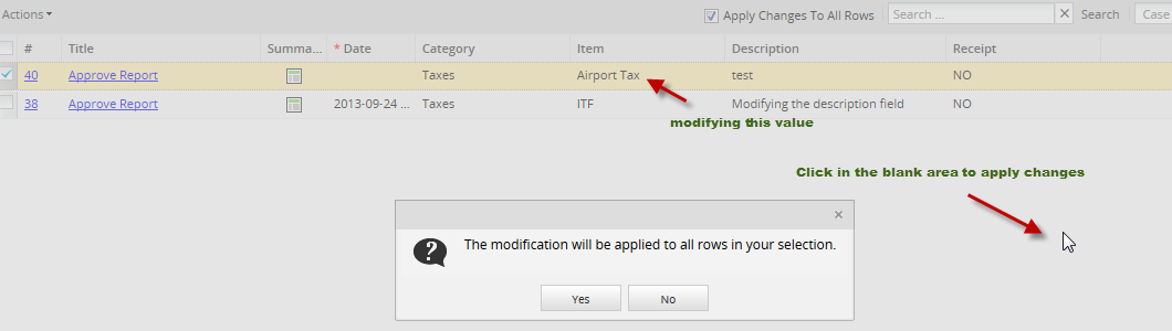 If more than one row needs to be modified with the same value, let's say a dropdown, mark the Apply Changes to All Rows and modify any value, then click on the blank area of the screen and the following message will display: