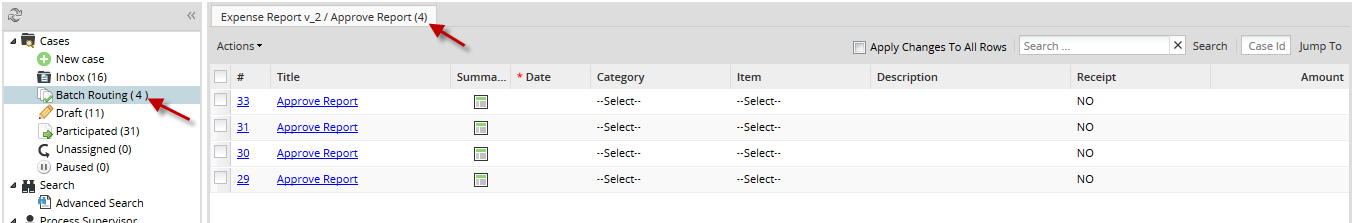 - In the consolidated list, each process, which has the batch routing plugin configured, will open in a different tab: