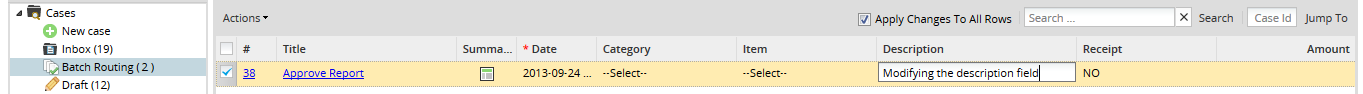 Batch Routing Plug-in is an extension that allows a batch derivation of cases for a process. This means that users can select one or more cases form the cases list to action them all at once. In addition, the information of those cases can be modified form the case list. The information is extracted from the fields of a grid previously created by the administrator. This plug-in can be set up on a ProcessMaker server.