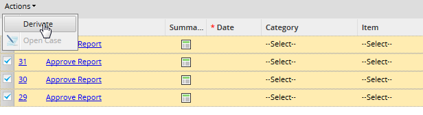 To derive cases in batch, just select the case or cases by marking the checkbox next to the number of the case and then click on "Action" and select "Derivate" option