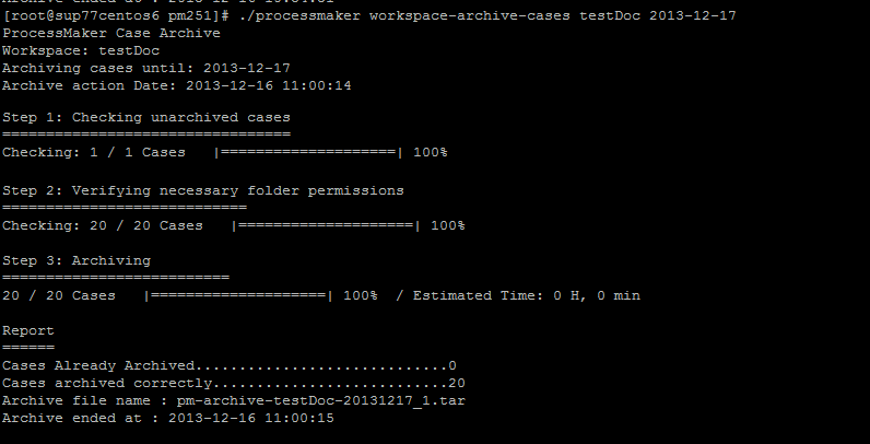 In the example, the workspace testDoc and the date: 2013-12-17 were defined, it means that all cases that belong to testDoc workspace and executed until 2013-12-16 (note that you have to define one day later in order to archive cases) will be archived.
