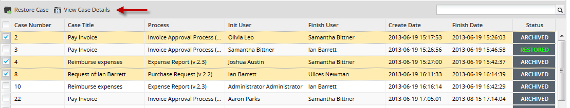 Once cases were restored, their status will change to RESTORED as you can see in the following image: